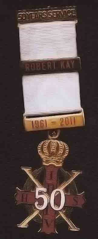 Apart from the consecration of E. Kt. David Campbell as Viceroy, and the Enthronement of E. Kt. Graham Harland as Sovereign, it was the 50th anniversary of one of the remaining founders, V. III. Kt. Robert kay, (1961-2011). The Recorder, III.Kt. Stephen Hulse read a brief summary of the career of V.III.Kt. Kay. He unfortunately could not attend due to very poor health. The Intendant-General added to the report by the Recorder, by informing those present of the content of the Certificate sent by GIC and he described the splendid jewel on a white ribbon with the '50' highlighted in the centre of the jewel. The members were then able to see the jewel as it was circulated around the Conclave. The Intendant-general will shortly arrange to visit V. III. Kt. Robert kay at his home to make the presentation personally. He will be accompanied by a small delegation from the Conclave. | ![]() |
