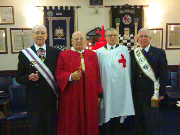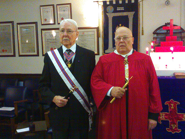 Ill Kt Ian Harold Scott, P G Chamb, a seasoned campaigner, installed his successor Ill Kt Norman Edward Williams, P G Pref, another seasoned campaigner of Red Cross Masonry, into the seat of Eusebius of the Conclave, with a great dignity, making a shortened ceremony have as much feeling as only he could. | |