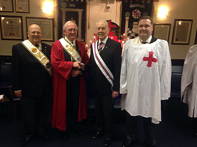The Past Intendant General, R. Ill. Kt, KEnneth Wilson Shaw KCC, was on hand to witness the ceremony and to congratulate Stan and Darren in attaining their offices. | |