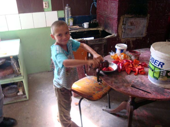 Left photo shows Dragos youngest son grinding peppers to make a paste for use on bread the father Ghita had been paid for a job he had done in three trays of peppers, such is the way a type of barter system. | |