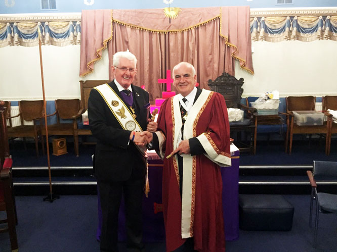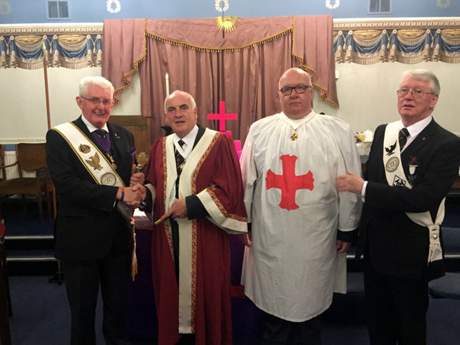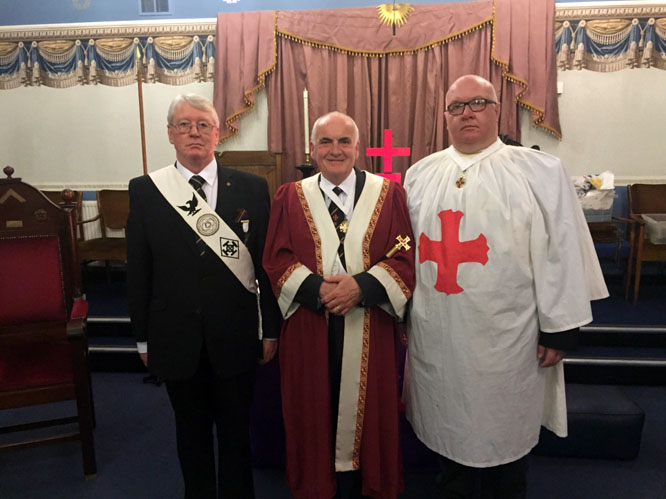 The meeting was opened by the Most Puissant Sovereign Ian Clark, who, after welcoming the Deputy Intendant General, proceeded to Enthrone his successor, Em.Kt. Patrick Joseph Walsh, W.Kt Stephen Keith Lyon was then Consecrated as Eminent Viceroy by the newly Enthroned Sovereign in a ceremony which all present agreed, was delivered in a very sincere manner. | |
