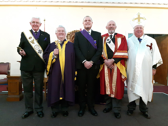 The evening commenced promptly at 6pm, with the Acting Most Puissant Sovereign. P.Kt. Ron Pearson standing in for P.Kt. Peter Guy, who was indisposed. Ron launched into the Conclaves business, with a relaxed manner that set the tone for the evening. He welcomed the Intendant General R.Ill. Kt Michael Walker, who in turn introduced the Divisional team to the Conclave. There was much joy, when the Conclave learned that there was to be an Installation that evening, the first for many years. A subsequent ballot, proved favourable for the candidate. Bro. Eddie Tucker. | |