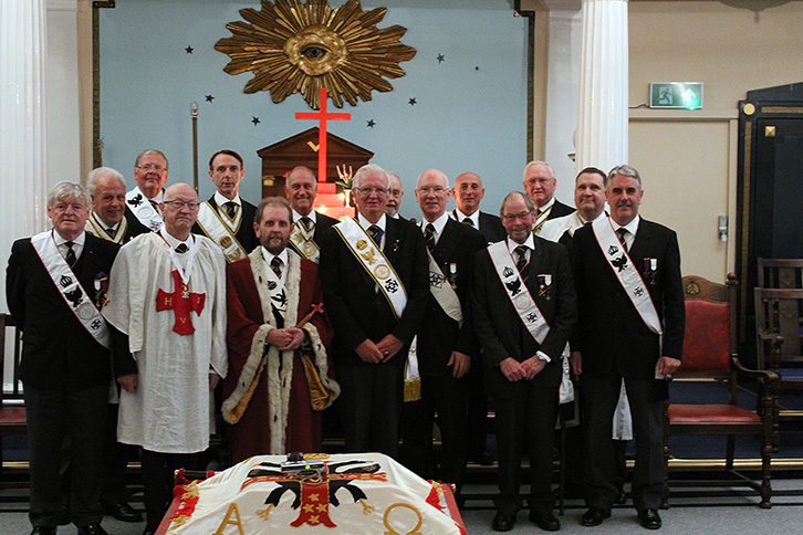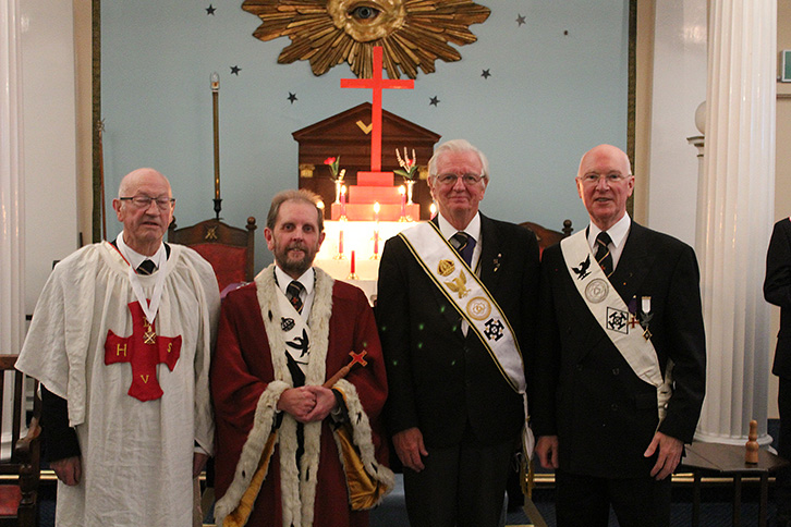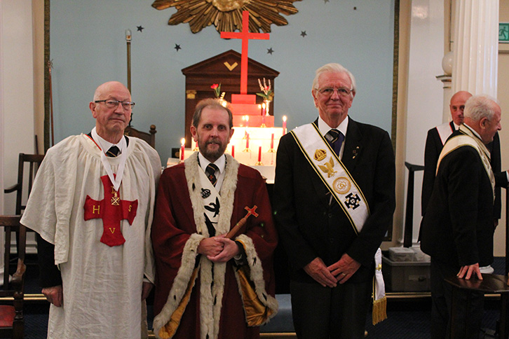 A well-attended meeting of St Helena Conclave witnessed an excellent Enthronement Ceremony under the watchful eye of Conclave Marshall, Stephen Gregory PGCh and DivDepM. The Division was represented by the new Divisional Eusebius, Ill Kt. Peter Schofield PGWofReg. Peter has strong links with St Helena, having presented a new baton to the Conclave some few years ago, and which he had made and hand carved himself. The baton continues to be used by the Conclave and is proudly passed on to each new Sovereign following Enthronement. | |