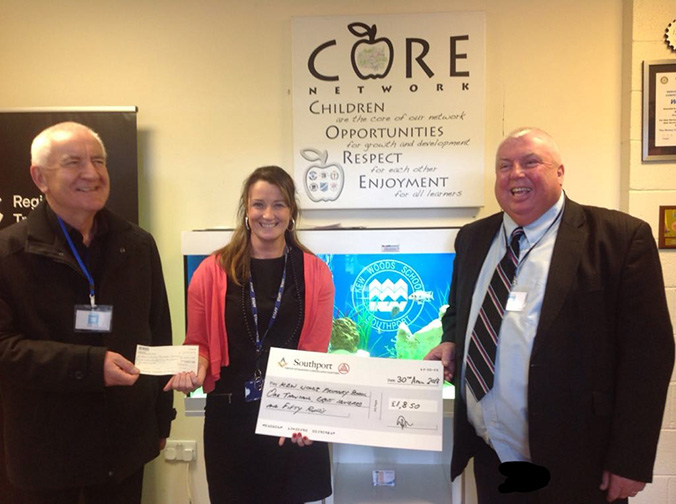 Puissant Knight Iain Brown, is seen presenting over £1850, in conjunction with the Chris Maclure foundation, to the Head Teacher of Kew Woods Primary School Southport. | |