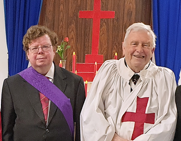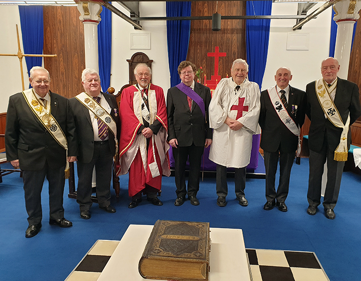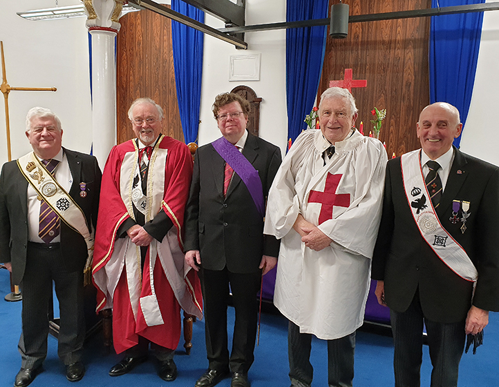 Jonathan was conducted within the Conclave, in an exemplary fashion, by P.Kt. John Anderson, and in due course admitted to the Order by the Puissant Sovereign, P.Kt. Ron Gates. There was a very special moment when Jon (Snr), invested Jonathan (Jnr) with the regalia of the degree. It was clear that the time spent in lockdown(s) had been well spent and the Marshal Derek Alty had a pleasant expression on his face as we came to the end of the ceremony. Derek finished it in style with his explanation of the cross and other symbolism used on the banner, along with a few other bits thrown in for good, if you will excuse the pun, measure. | |