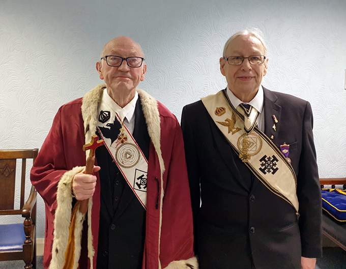 We assembled in the lower Lodge room where the Conclave opened in the Red Cross and discharged its administrative duties, before the Acting Most Puissant Sovereign, Ill. Kt. Terry Bailey announced the next business was to enthrone P. Kt. David Pestell as Sovereign. I have to say that Terry conducted the business in a very efficient and friendly manner. It is no secret that David and Terry have been friends for many years, and it showed! | |