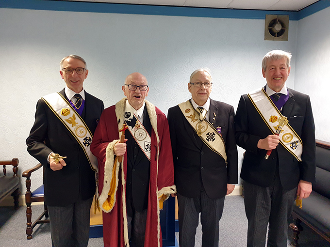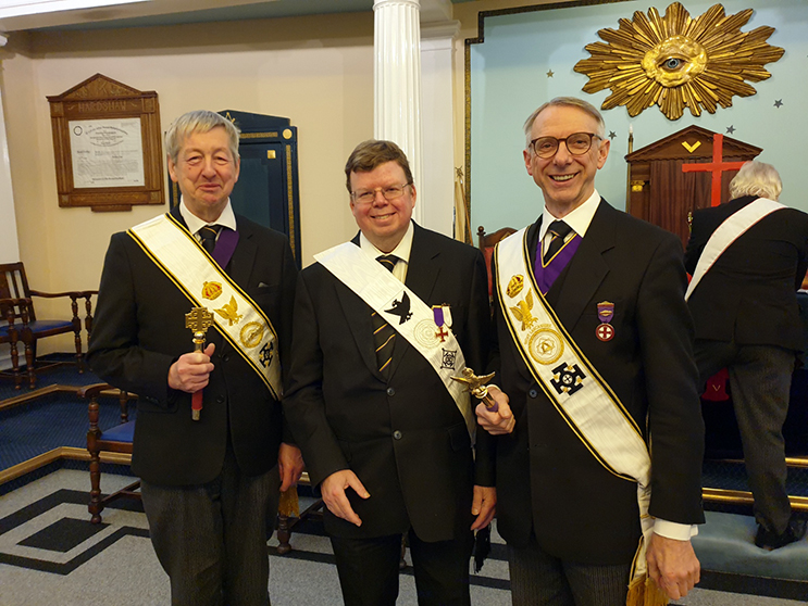 We all then made our way up to the magnificent Lodge room on the top floor in preparation for a KHS ceremony. The Conclave Scribe, Stephen Gregory, had assembled a team of officers from across the many Conclaves of the Division to work the ceremony for Worthy Knight Jonathan Measures of Hesketh Conclave which meets at Chorley under the Direction of the Divisional Marshal, Ill. Kt Ray Pye. | |