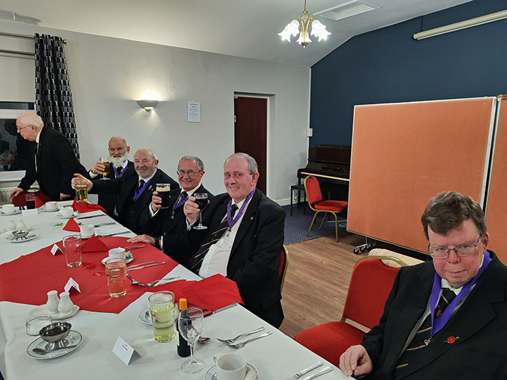 The formalities having been appropriately concluded and the Conclave closed all present settled down to an three course meal of spring rolls, lamb and cheesecake, which was very much in keeping with the high standard usually provided by the Prescot caterer. | |