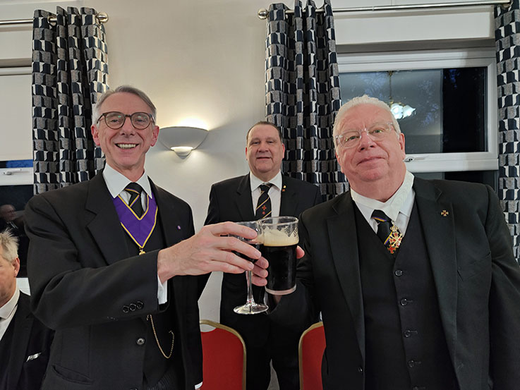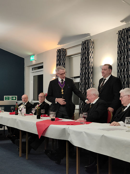 In response to the toast to his health the Intendent General made particular reference to the Tripartite meeting which takes place once every two years between the divisions of West Lancashire, North & East Lancashire, and Cumbria. At this meeting a KHS ceremony is worked with each division providing a representative candidate and working one of the three points. This year’s meeting will be held in Carlisle on the 20th of July, with West Lancashire working the second point of the ceremony (any Knights wishing to be involved with the Divisional team working the ceremony are encouraged to contact the Deputy Intendent General!) He also congratulated the new Sovereign and wished him a happy year in office, extending those good wishes to the installing Sovereign, the new Viceroy and all the Knights of Prescot Conclave. | |
